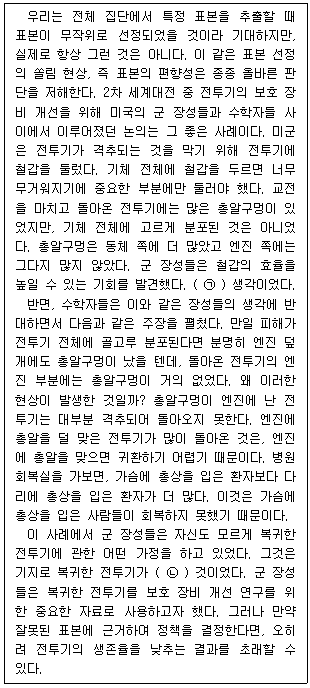 ㉠:전투기에서 총알을 많이 맞는 동체 쪽에 철갑을 집중해야 충분한 보호 효과를 볼 수 있다는