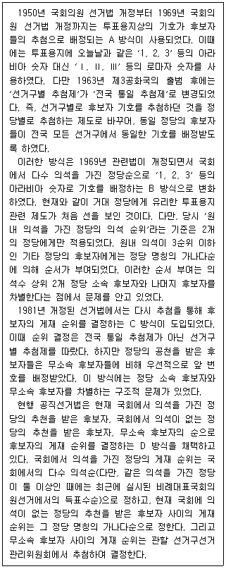 C 방식과 D 방식에서 원내 의석이 없는 정당의 후보자는 무소속 후보자에 비해 앞 번호 기호를 배정받는다.