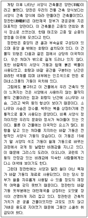 정관헌은 동서양의 건축적 특징이 조합된 양관으로서 궁궐 건물이었다.