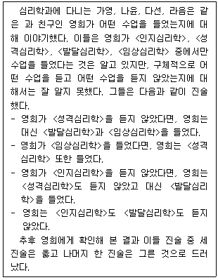 다음 글의 내용이 참일 때, 영희가 들은 수업의 최소 개수와 최대 개수는?(순서대로 최소, 최대)