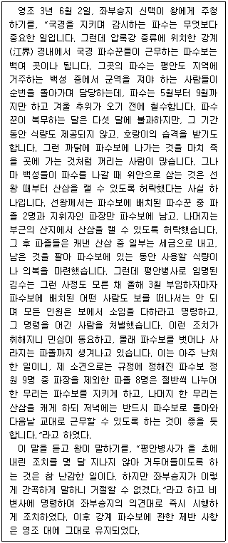 영조 3년 5월에 비해 다음 해 5월 강계의 파수보에서 파수 근무해야 하는 1일 인원수가 줄어들었을 것이다.
