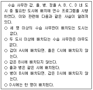 병이 C시에 배치되면, 갑은 D시에 배치되지 않는다.
