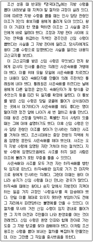 지방 수령으로 임명된 사람은 사은숙배를 하기 전에 반드시 의정부를 찾아가 사조라는 절차를 거행해야 했다.