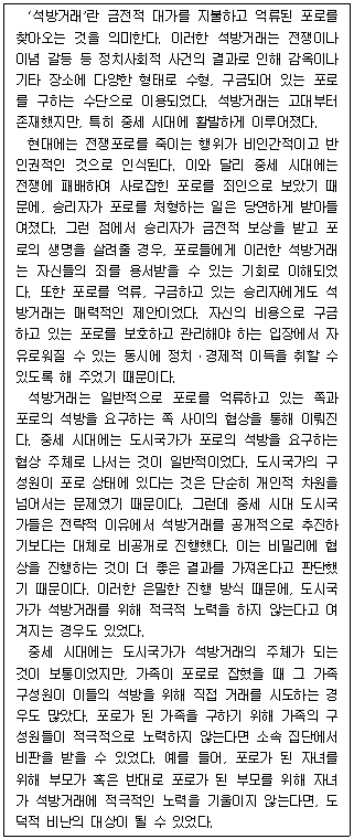 중세 시대에 석방거래가 이루어진 주된 이유는 포로들의 인권을 보호하기 위해서였다.