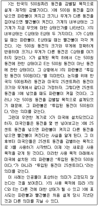 X의 파란불이 “투입된 동전이 500원이다.”를 의미하는지의 여부는 X에 투입된 동전이 무엇인지에 의해 결정된다.