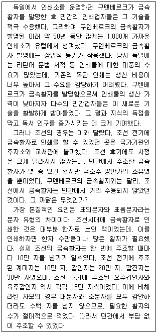 활자로 만들어야 할 문자의 유형 차이로 구텐베르크의 금속활자와 조선의 금속활자는 민간의 수용 정도에 있어 차이가 있었다.