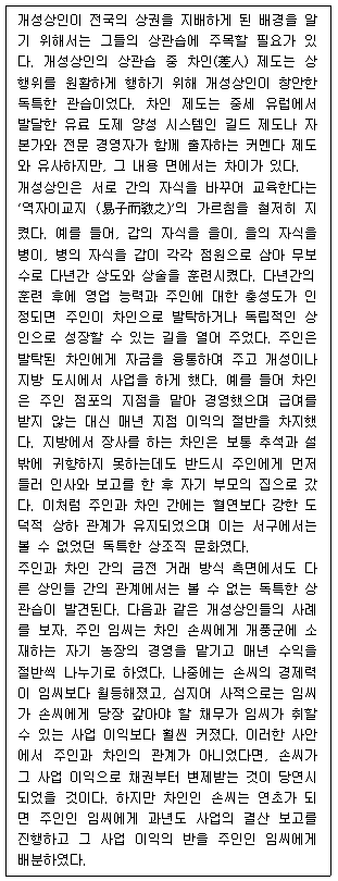 개성상인은 영업 능력이 인정될 경우, 다른 사람이 훈련시킨 점원을 자신의 차인으로 발탁하였다.