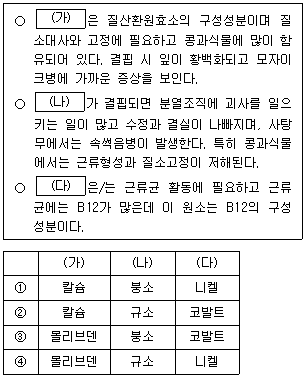 다음은 콩과식물의 근류균에 관여하는 원소를 설명한 것이다. (가)~(다)에 들어갈 원소를 바르게 연결한 것은?