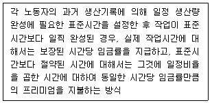 임금을 성과급이나 할증급 등 노동 능률에 직접 관련시켜 지급하는 능률급 방식 중에서 아래의 설명 내용과 일치하는 것은?
