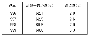 다음 표는 외환위기를 전후한 수년간의 경제활동참가율 및 실업률을 보인 것이다. 외환위기 직후의 노동시장사정을 올바르게 추론한 것은?