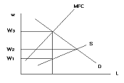다음 그림은 수요독점적인 노동시장에서의 임금과 고용의 결정을 보인 것이다. 이 시장에서 이제 노동조합이 조직되어 노동시장이 쌍방독점 상태로 된다고 하자. 임금상승과 고용증가를 동시에 달성할 수 있는 임금구간은?