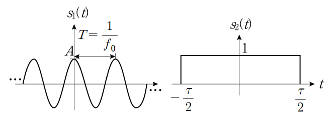 다음 정현파 s1(t)와 구형파 s2(t)가 혼합기에서 서로 곱해진 후 출력될 때, 출력 신호의 스펙트럼은? (단, T≪τ 이다)