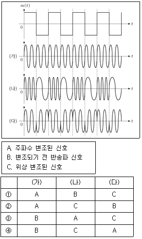 다음 메시지 신호 m(t)를 변조할 때, 신호 파형 (가)~(다)와 신호 명칭 A~C를 바르게 연결한 것은?