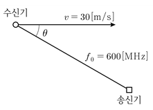 그림과 같이 수신기가 v의 속도로 화살표 방향으로 이동하면서 정지된 송신기로부터 주파수가 f0인 신호를 받고 있다. θ=30°일 때, 도플러 주파수[Hz]는? (단, 전파속도는 3×108[m/s]이다)