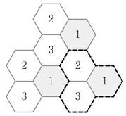 그림은 이동통신 시스템에서 주파수 재사용을 위해 인접한 3개의 셀을 하나의 클러스터로 구성한 것이다. 셀 반경이 2[km]이고 각 셀에 주파수 대역폭을 균등하게 할당할 때, 동일 주파수 대역을 사용하는 셀 중심 간 최소거리[km]는? (단, 셀은 그림에 도식된 6각형 1개를 의미한다)