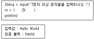다음은 사용자로부터 입력받은 문자열에서 처음과 끝의 3글자를 추출한 후 합쳐서 출력하는 파이썬 코드에서 ㉠에 들어갈 내용은?