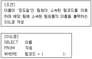 다음 [조건]에 부합하는 SQL문을 작성하고자 할 때, [SQL문]의 빈칸에 들어갈 내용으로 옳은 것은? (단, '팀코드' 및 '이름'은 속성이며, '직원'은 테이블이다.)