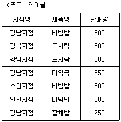 다음 테이블을 보고 강남지점의 판매량이 많은 제품부터 출력되도록 할 때 다음 중 가장 적절한 SQL 구문은? (단, 출력은 제품명과 판매량이 출력되도록 한다.)