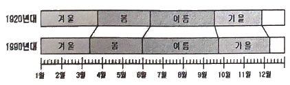 그림은 우리나라 어느 지역의 1920년대와 1990년대의 계절 길이변화를 분석한 결과이다. 다음 중 계절 길이변화와 가장 관련이 높은 것은?