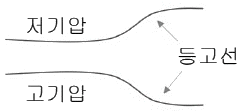 그림과 같이 북반구 상층 일기도에서 바람이 좁은 등고선 간격의 영역으로부터 넓은 등고선 간격의 영역으로 볼 때, 바람 변화의 설명이 옳은 것은?