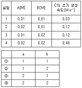 A+B→C 반응에서 A와 B의 초기 농도를 달리하면서 C가 생성되는 초기 속도를 측정하였다. 속도=k[A]a[B]b라고 나타낼 때, a, b로 옳은 것은?