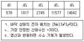 다음은 3주기 원소 중 하나의 순차적 이온화 에너지(IEn[kJmol-1])를 나타낸 것이다. 이 원자에 대한 설명으로 옳은 것만을 모두 고른 것은?