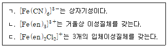 팔면체 철 착이온 [Fe(CN)6]3-, [Fe(en)3]3+, [Fe(en)2Cl2]+에 대한 설명으로 옳은 것만을 모두 고르면? (단, en은 에틸렌다이아민이고 Fe는 8족 원소이다)