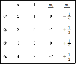 다음 양자수 조합 중 가능하지 않은 조합은? (단, n은 주양자수, l은 각 운동량 양자수, ml은 자기 양자수, ms는 스핀 양자수이다)