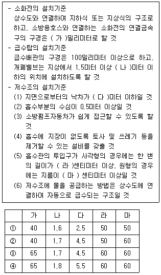 다음은 「소방기본법」 및 같은 법 시행규칙상 소방용수시설의 설치기준에 관한 설명이다. '가~마'에 들어갈 내용으로 옳은 것은?