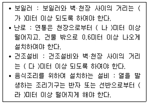 「소방기본법」상 불을 사용하는 설비의 관리기준 등에 대한 설명이다. ( ) 안에 들어갈 숫자로 옳은 것은? (순서대로 (가), (나), (다), (라))