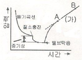 그림은 진공스스템의 공기를 펌프로 뺄 때 나타나는 대표적인 배기특성곡선이다. A와 B((가)구간)의 구역이 나타나는 것은?