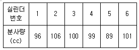 4행정 사이클 디젤엔진 분사펌프의 제어 랙크를 전부하 상태로 하고 분사량을 측정한 결과표이다. 수정하지 않아도 되는 실린더는? (단, 분사량 불균률의 한계는 ±3%이다.)