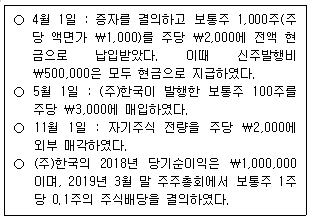 다음은 (주)한국의 2018년 1월 1일 자본계정의 내역이다.