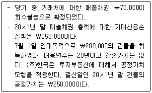 제조업을 영위하는 (주)한국의 20×1년 말 재무상태표에는 매출채권에 대한 손실충당금(대손충당금) 기초 잔액은 ₩200,000이며, 이익잉여금 기초 잔액은 ₩30,000이었다. 20×1년 중 발생한 다음 사항을 반영하기 전의 당기순이익은 ₩150,000이다.