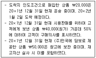 (주)한국의 20×1년 기초재고자산은 ₩100,000, 당기매입액은 ₩200,000이다. (주)한국은 20×1년 12월 말 결산과정에서 재고자산 실사 결과 기말재고가 ₩110,000인 것으로 파악되었으며, 다음의 사항은 고려하지 못하였다. 이를 반영한 후 (주)한국의 20×1년 매출원가는?