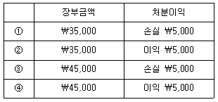 (주)한국은 20×1년 10월 1일 기계장치를 ₩80,000(내용연수 5년, 잔존가치 ₩5,000, 연수합계법, 월할 상각)에 취득하였다. 동 기계장치를 20×3년 3월 31일 ₩40,000에 처분할 경우, 처분시점의 장부금액과 처분손익을 바르게 연결한 것은? (단, 기계장치는 원가모형을 적용하고 손상차손은 발생하지 않았다.)