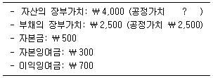 만약, 이 중 75%를 ₩2,000에 취득하고 영업권 ₩500을 인식한다면 (주)민국의 자산 공정가치는?