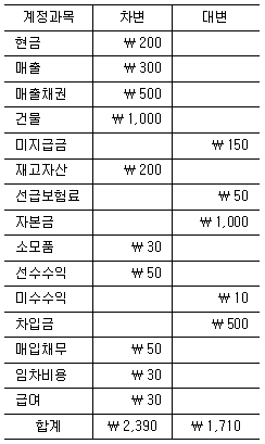 20×1년 초 설립한 (주)한국의 20×1년 말 수정전시산표는 회계기록상 계정잔액의 오류가 없었음에도 불구하고, 차변 합계와 대변 합계가 일치하지 않았다.