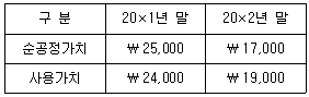 (주)한국은 20×1년 7월 1일 기계장치(정액법 상각, 내용연수 3년, 잔존가치 ₩0)를 ₩36,000에 취득하여 원가모형을 적용하고 있다. 기계장치의 순공정가치와 사용가치는 다음과 같다.