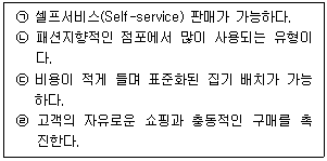 글상자에서 점포 레이아웃(Lay-out)의 유형 중 격자형 배치에 대한 내용으로 옳은 것을 모두 고르면?