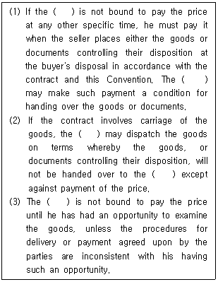 국제물품매매계약에 관한 유엔협약(CISG, 1980) 제58조의 내용이다. ( )에 들어갈 용어를 순서대로 바르게 나열한 것은?