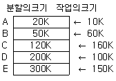 다음 표는 고정 분할에서의 기억 장치 Fragmentation현상을 보이고 있다. External Fragmentation은 총 얼마인가?