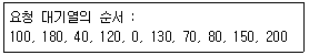 현재 헤드의 위치가 50에 있고, 요청 대기열의 순서가 다음과 같을 경우, C-SCAN 스케줄링 알고리즘에 의한 헤드의 총 이동 거리는 얼마인가? (단, 현재 헤드의 이동 방향은 안쪽이며, 안쪽의 위치는 0으로 가정한다.)