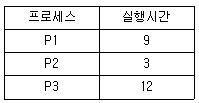 다음과 같은 3개의 작업에 대하여 FCFS 알고리즘을 사용할 때, 임의의 작업 순서로 얻을 수 있는 최대 평균 반환 시간을 T, 최소 평균 반환 시간을 t라고 가정했을 경우 T-t의 값은?