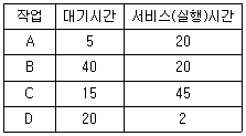 HRN 스케쥴링 방식에서 입력된 작업이 다음과 같을 때 우선순위가 가장 높은 것은?