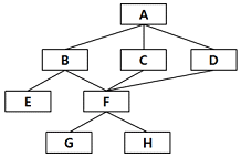 다음은 어떤 프로그램 구조를 나타낸다. 모듈 F에서의 fan-in과 fan-out의 수는 얼마인가?
