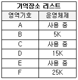 주기억장치 배치 전략 기법으로 최적 적합 방법을 사용한다고 할 때, 다음과 같은 기억장소 리스트에서 10K 크기의 작업은 어느 기억공간에 할당되는가? (단, K=kilo이고, 탐색은 위에서부터 아래로 한다고 가정한다.).
