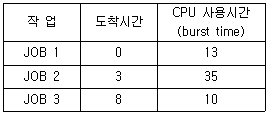 FIFO 스케줄링에서 3개의 작업 도착시간과 CPU 사용시간(burst time)이 다음 표와 같다. 이 때 모든 작업들의 평균 반환시간(turn around time)은? (단, 소수점 이하는 반올림 처리한다.)