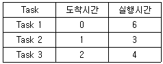 다음과 같은 Task List에서 SJF방식으로 Scheduling할 경우 Task 2의 종료 시간을 구하면? (단, 발생되는 Overhead는 무시한다.)