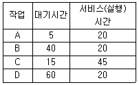 HRN 방식으로 스케줄링 할 경우 입력된 작업이 다음과 같을 때 우선순위가 가장 높은 것은?